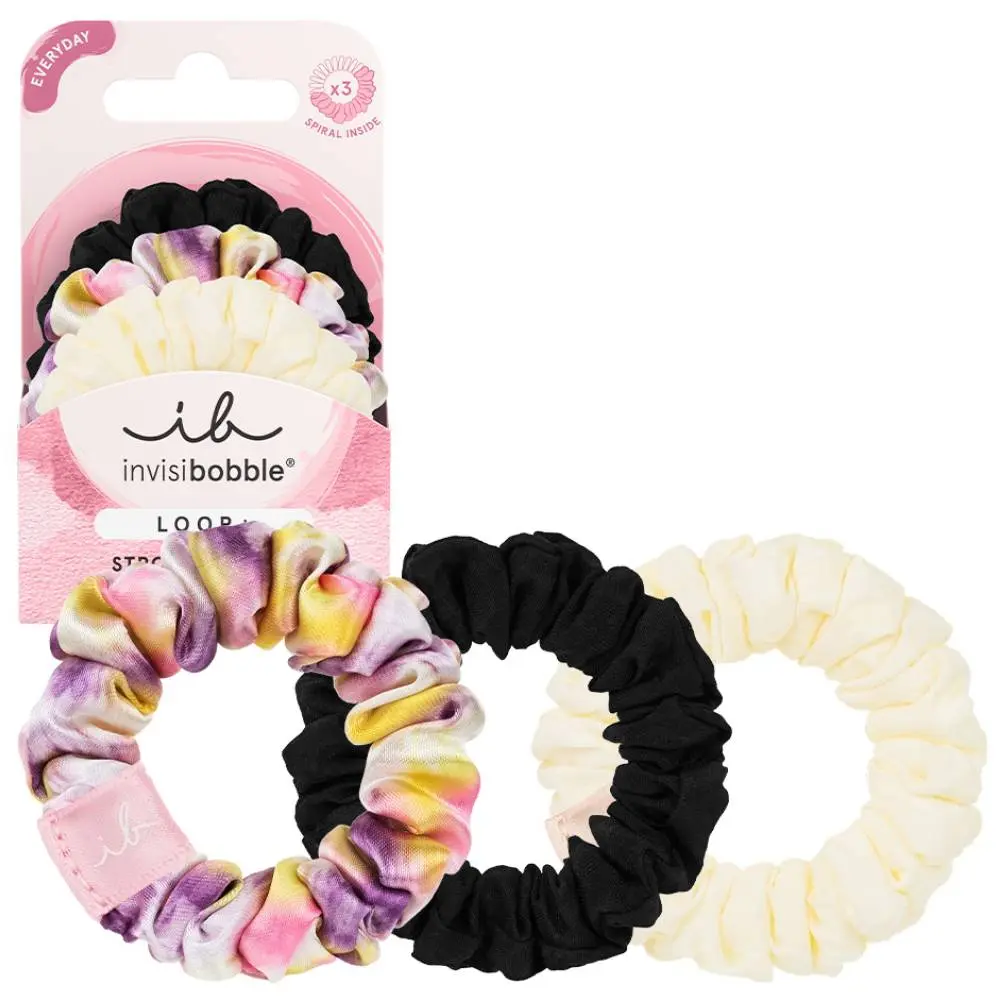 Новая категория аксессуаров в коллекции бренда invisibobble: тонкая тканевая резинка Loop Plus для трендовой гладкой прически без компромиссов! Набор резинок-браслетов для волос Loop Plus Be Strong – это три элегантных резинки из шелковистой ткани в черном, молочном и сиренево-розовом оттенках. Плотная спиралевидная резиночка Power, вшитая внутрь, обеспечивает надежную фиксацию прически в течение всего дня, не доставляя дискомфорт и не повреждая волосы. Подходит для любых образов. Рекомендована для густых и кудрявых волос.