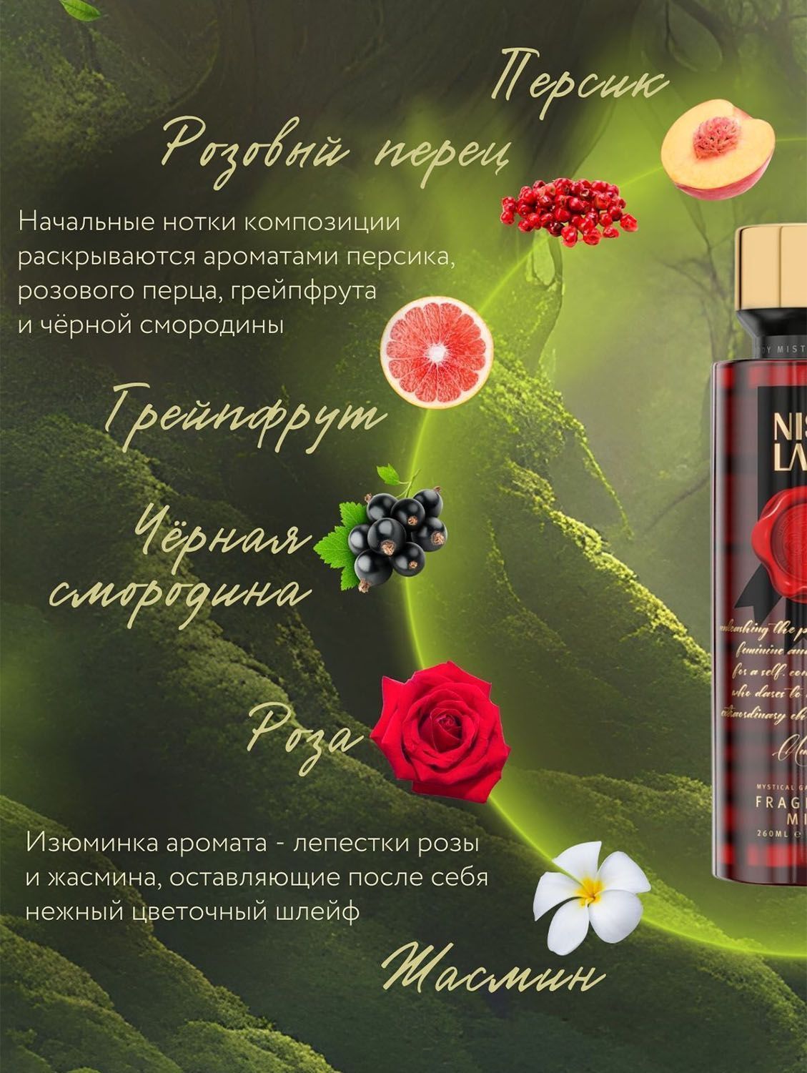 Аромат миста для тела — сладкий, с нотами чёрной смородины и розы.