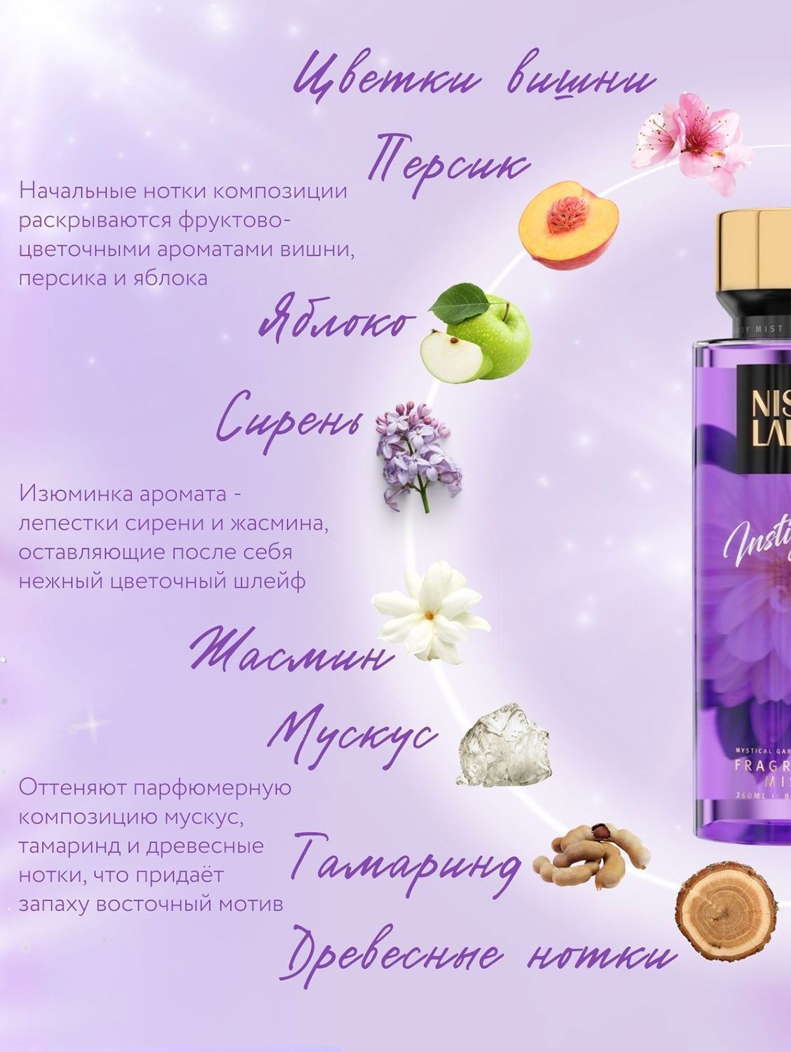 Аромат миста для тела — сладкий аромат фруктов и сирени.