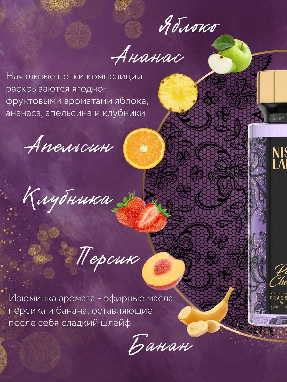 Аромат миста для тела — сладкий аромат фруктов и карамели.