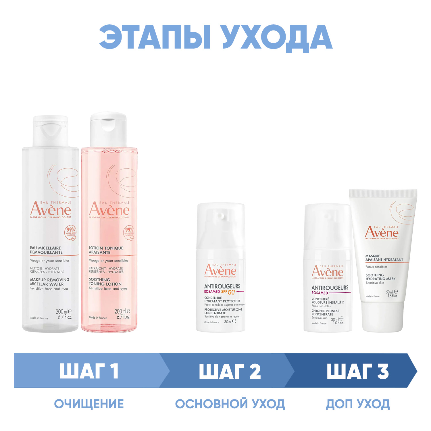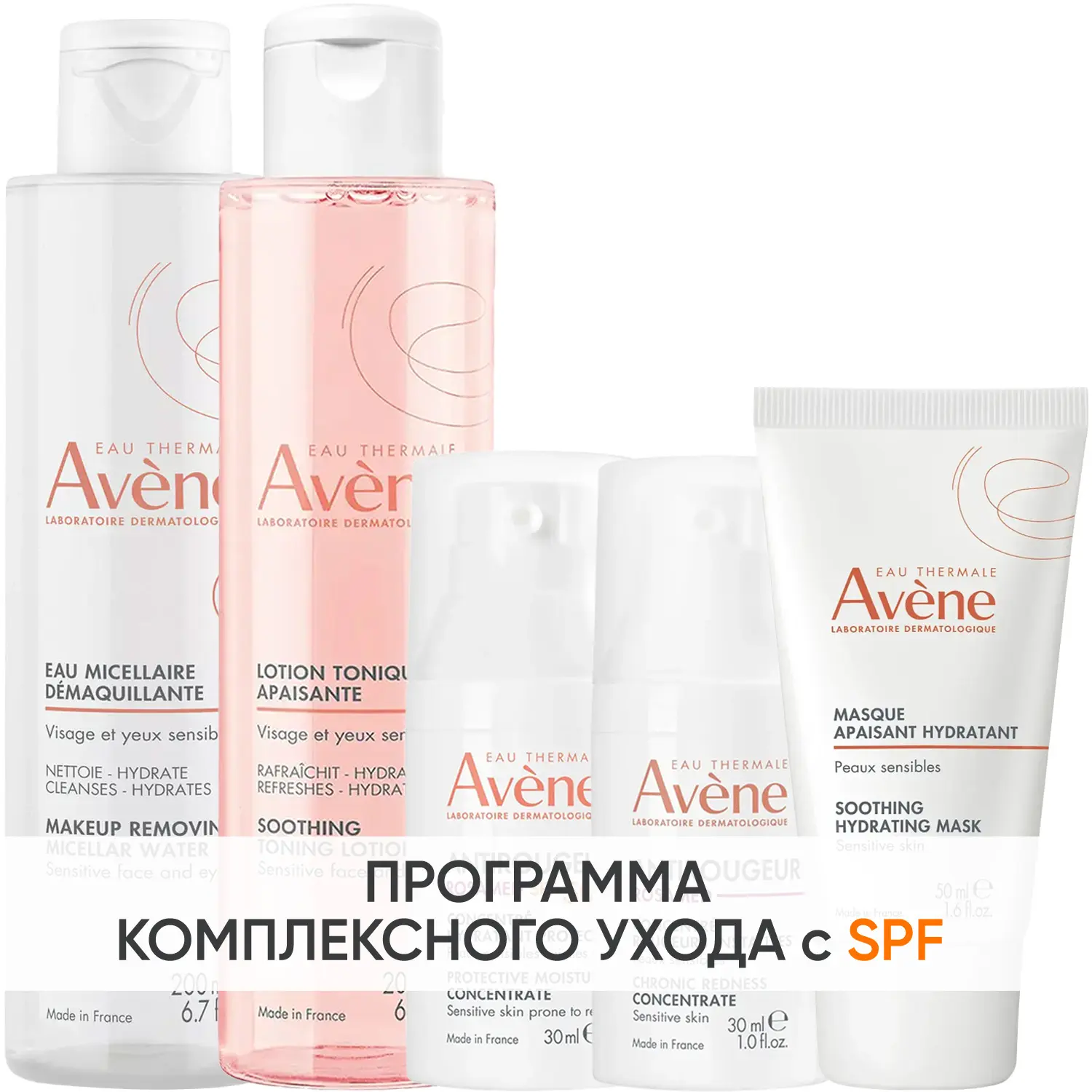 Мицеллярный лосьон: термальная вода Avene, мягкая очищающая основа.