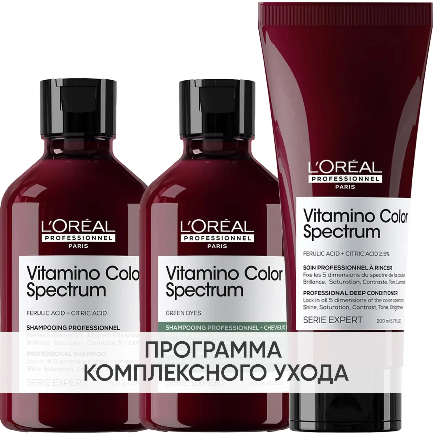 Эксперты проекта «Космедэль»* предлагают ПРОГРАММУ КОМПЛЕКСНОГО УХОДА L'Oreal Professionnel Vitamino Color Spectrum для защиты всех параметров цвета (блеск, насыщенность, контраст, оттенок и яркость) и придания волосам сияния. Комплексный уход - это дополняющие друг друга средства, совместное использование которых максимально эффективно. Первым шагом программы является базовый уход (очищение + питание), вторым – дополнительный уход (средства, усиливающие эффект базовой программы и применяемые постоянно или периодически).