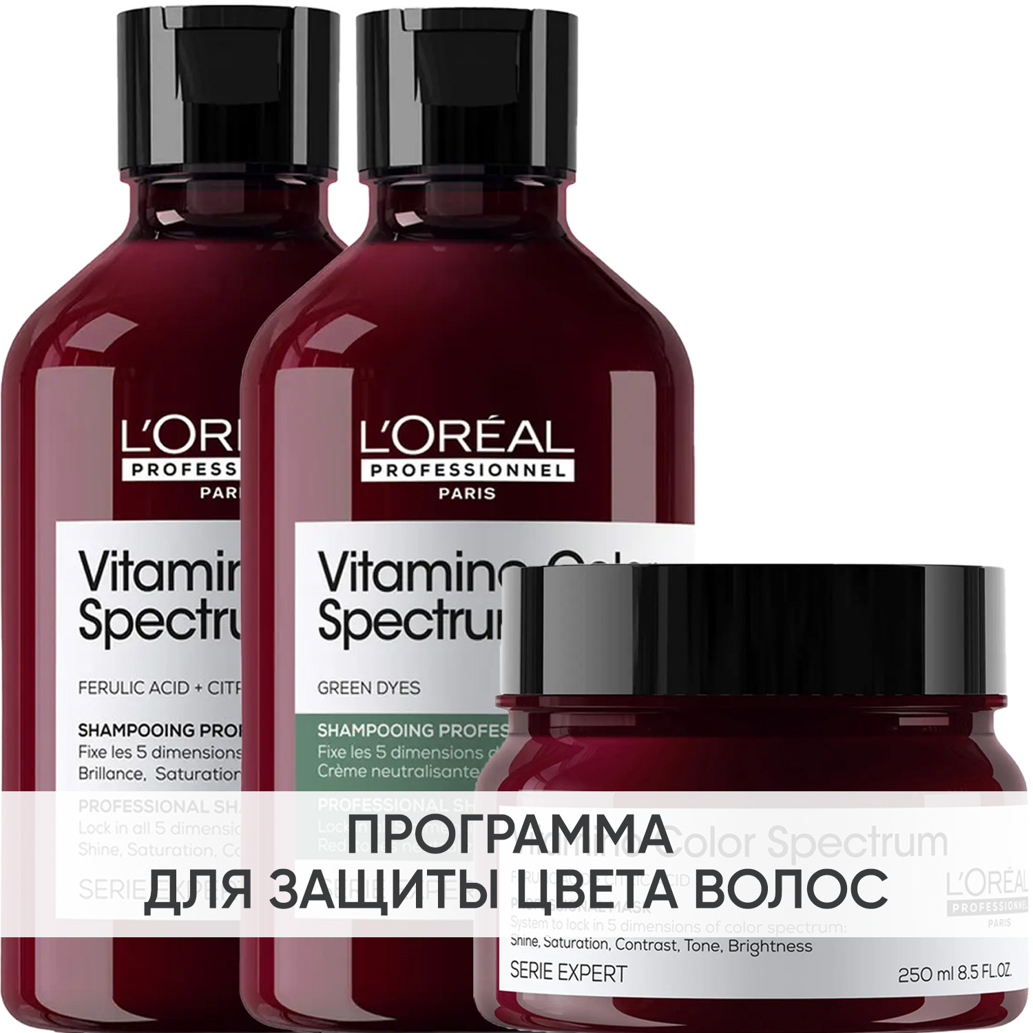 Эксперты проекта «Космедэль»* предлагают ПРОГРАММУ КОМПЛЕКСНОГО УХОДА L'Oreal Professionnel Vitamino Color Spectrum для защиты всех параметров цвета (блеск, насыщенность, контраст, оттенок и яркость) и придания волосам сияния. Комплексный уход - это дополняющие друг друга средства, совместное использование которых максимально эффективно. Первым шагом программы является базовый уход (очищение + питание), вторым – дополнительный уход (средства, усиливающие эффект базовой программы и применяемые постоянно или периодически).