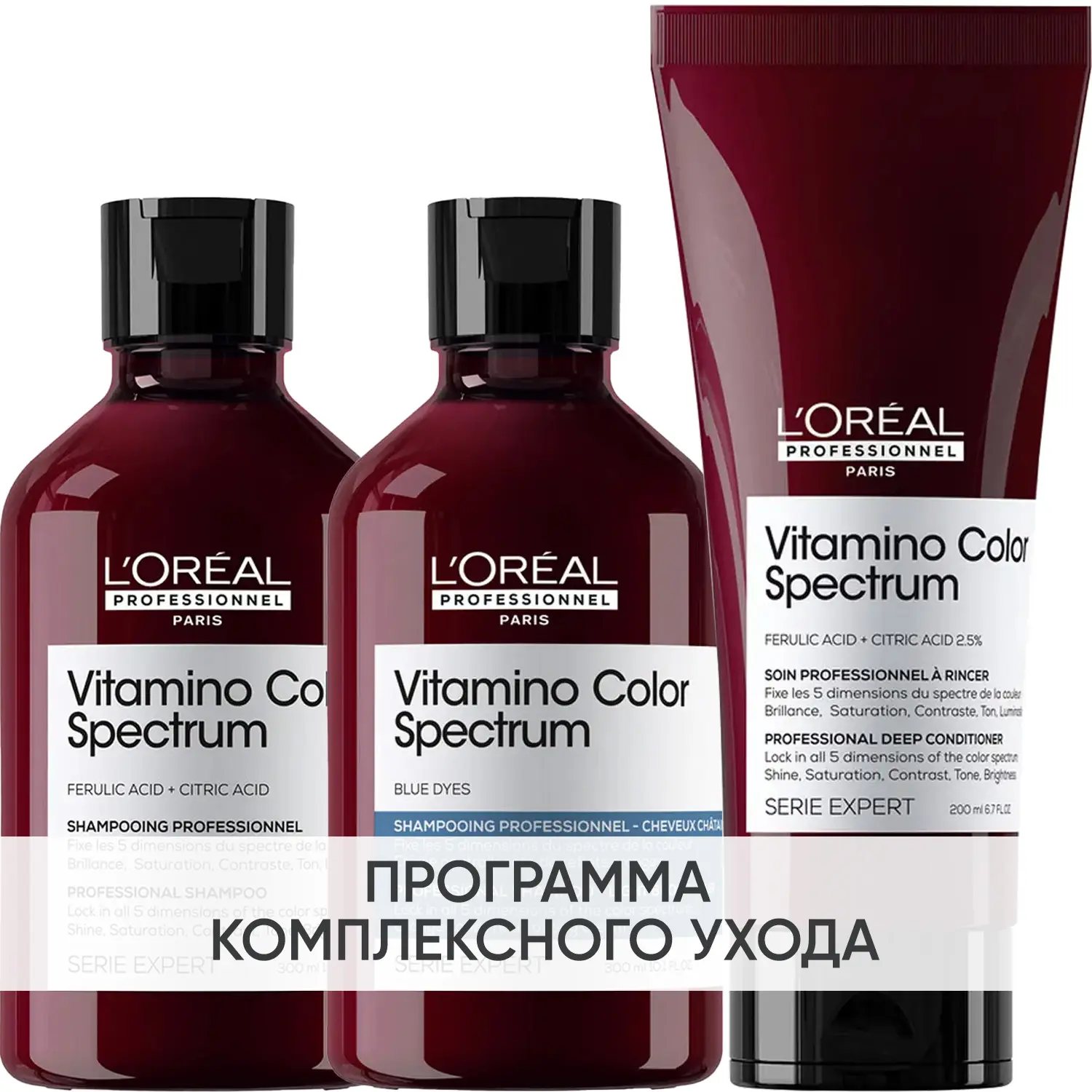 Эксперты проекта «Космедэль»* предлагают ПРОГРАММУ КОМПЛЕКСНОГО УХОДА L'Oreal Professionnel Vitamino Color Spectrum для защиты всех параметров цвета (блеск, насыщенность, контраст, оттенок и яркость) и придания волосам сияния. Комплексный уход - это дополняющие друг друга средства, совместное использование которых максимально эффективно. Первым шагом программы является базовый уход (очищение + питание), вторым – дополнительный уход (средства, усиливающие эффект базовой программы и применяемые постоянно или периодически).