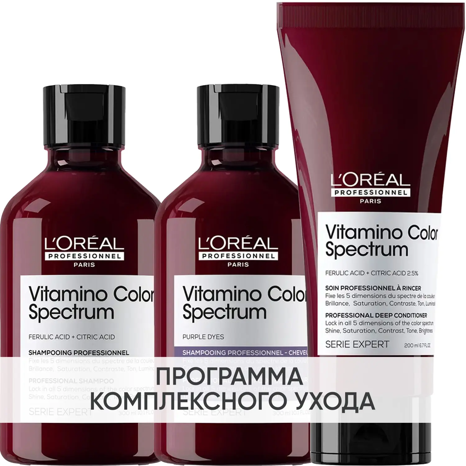 Эксперты проекта «Космедэль»* предлагают ПРОГРАММУ КОМПЛЕКСНОГО УХОДА L'oreal Professionnel Vitamino Color Spectrum для защиты всех параметров цвета (блеск, насыщенность, контраст, оттенок и яркость) и придания волосам сияния. Комплексный уход - это дополняющие друг друга средства, совместное использование которых максимально эффективно. Первым шагом программы является базовый уход (очищение + питание), вторым – дополнительный уход (средства, усиливающие эффект базовой программы и применяемые постоянно или периодически).