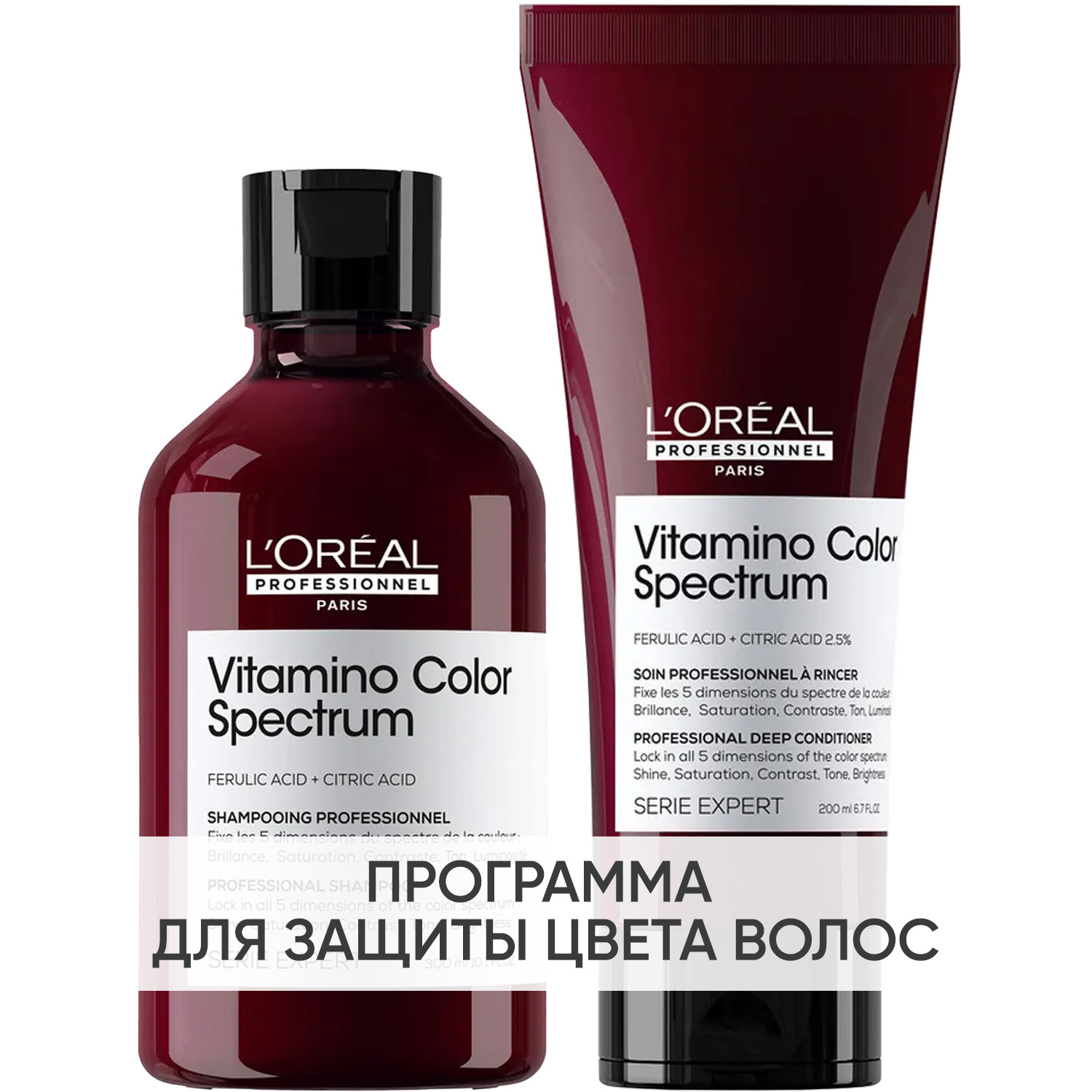 Эксперты проекта «Космедэль»* предлагают ПРОГРАММУ КОМПЛЕКСНОГО УХОДА L'oreal Professionnel Vitamino Color Spectrum для защиты всех параметров цвета (блеск, насыщенность, контраст, оттенок и яркость) и придания волосам сияния. Комплексный уход - это дополняющие друг друга средства, совместное использование которых максимально эффективно. Первым шагом программы является базовый уход (очищение + питание), вторым – дополнительный уход (средства, усиливающие эффект базовой программы и применяемые постоянно или периодически).