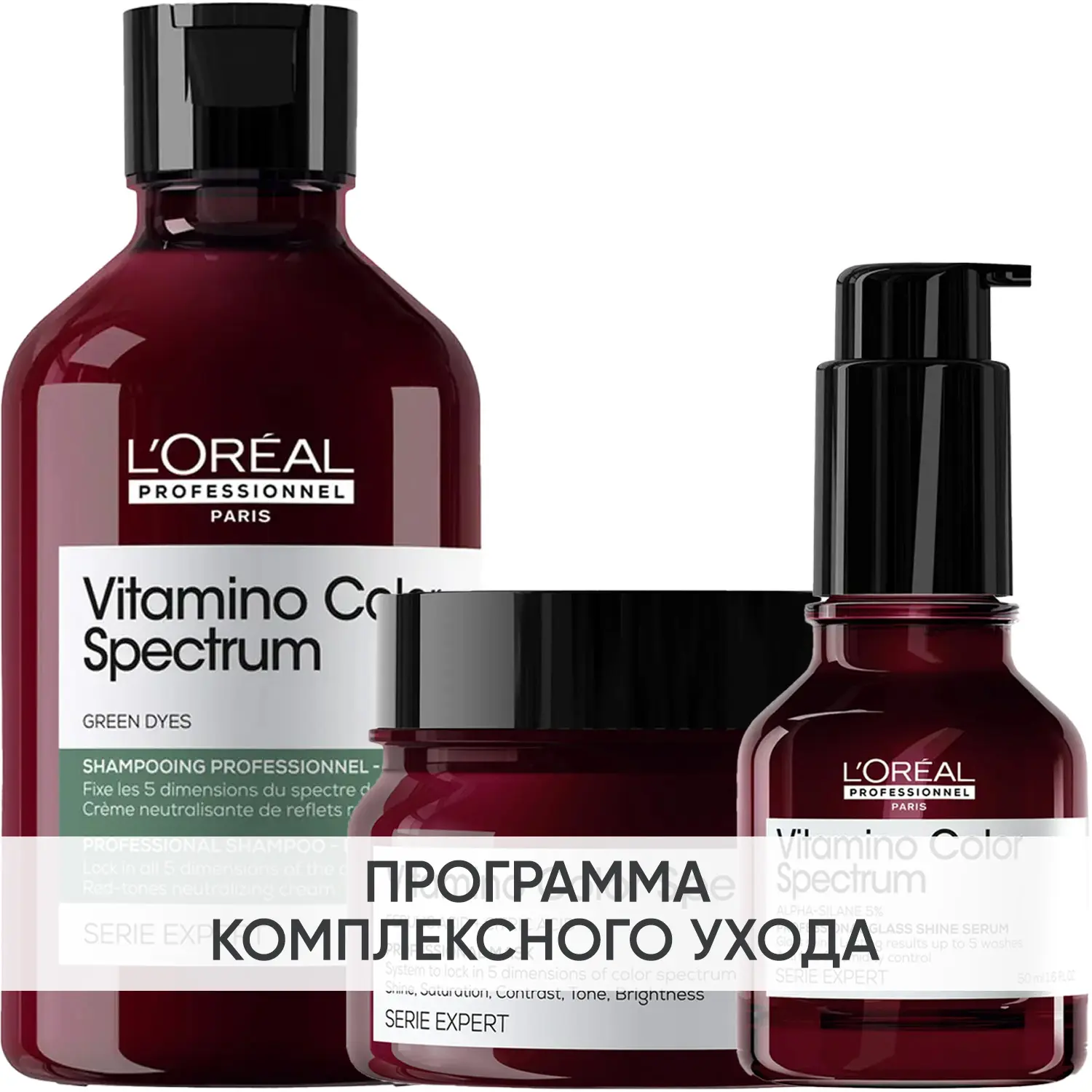 Эксперты проекта «Космедэль»* предлагают ПРОГРАММУ КОМПЛЕКСНОГО УХОДА L'Oreal Professionnel Vitamino Color Spectrum для защиты всех параметров цвета (блеск, насыщенность, контраст, оттенок и яркость) и придания волосам сияния. Комплексный уход - это дополняющие друг друга средства, совместное использование которых максимально эффективно. Первым шагом программы является базовый уход (очищение + питание), вторым – дополнительный уход (средства, усиливающие эффект базовой программы и применяемые постоянно или периодически).