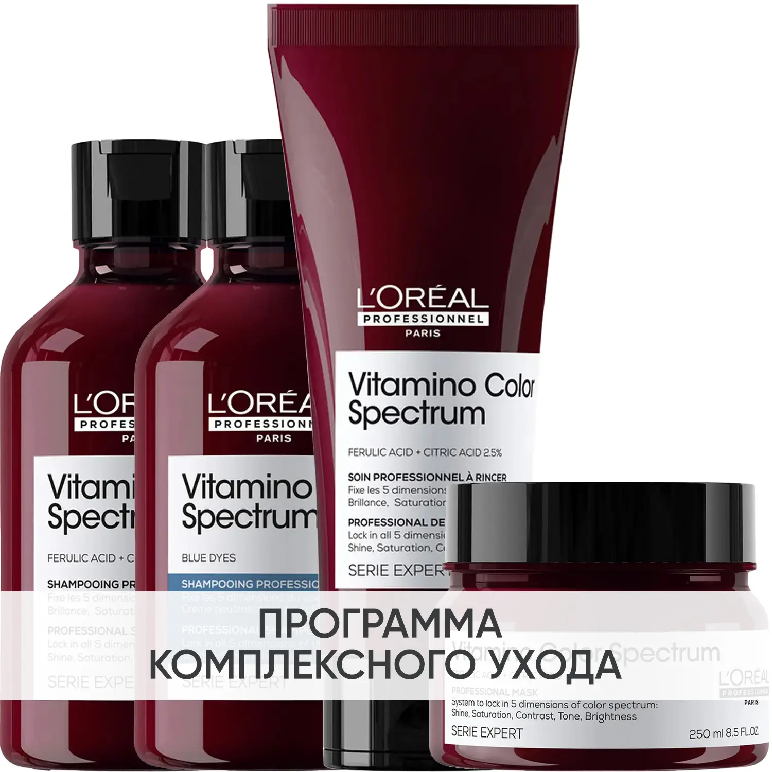 Эксперты проекта «Космедэль»* предлагают ПРОГРАММУ КОМПЛЕКСНОГО УХОДА L'Oreal Professionnel Vitamino Color Spectrum для защиты всех параметров цвета (блеск, насыщенность, контраст, оттенок и яркость) и придания волосам сияния. Комплексный уход - это дополняющие друг друга средства, совместное использование которых максимально эффективно. Первым шагом программы является базовый уход (очищение + питание), вторым – дополнительный уход (средства, усиливающие эффект базовой программы и применяемые постоянно или периодически).
