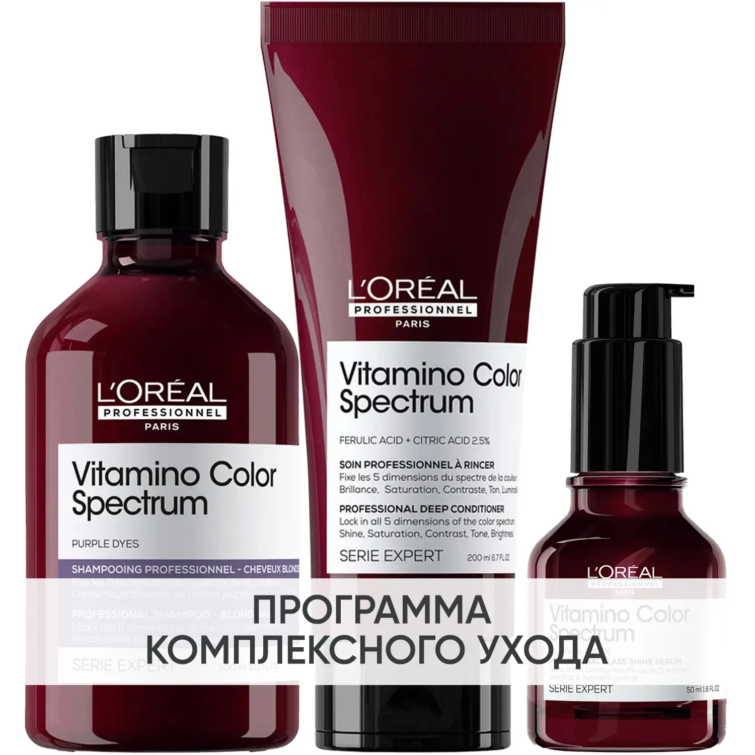 Эксперты проекта «Космедэль»* предлагают ПРОГРАММУ КОМПЛЕКСНОГО УХОДА L'oreal Professionnel Vitamino Color Spectrum для защиты всех параметров цвета (блеск, насыщенность, контраст, оттенок и яркость) и придания волосам сияния. Комплексный уход - это дополняющие друг друга средства, совместное использование которых максимально эффективно. Первым шагом программы является базовый уход (очищение + питание), вторым – дополнительный уход (средства, усиливающие эффект базовой программы и применяемые постоянно или периодически).