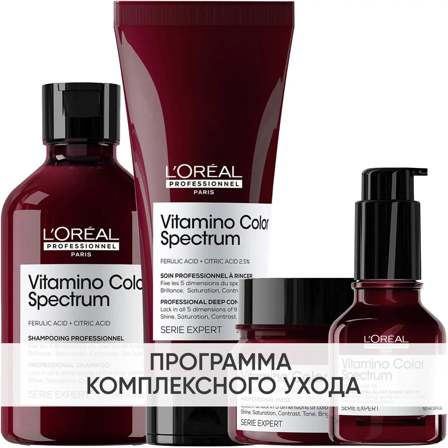 Эксперты проекта «Космедэль»* предлагают ПРОГРАММУ КОМПЛЕКСНОГО УХОДА L'oreal Professionnel Vitamino Color Spectrum для защиты всех параметров цвета (блеск, насыщенность, контраст, оттенок и яркость) и придания волосам сияния. Комплексный уход - это дополняющие друг друга средства, совместное использование которых максимально эффективно. Первым шагом программы является базовый уход (очищение + питание), вторым – дополнительный уход (средства, усиливающие эффект базовой программы и применяемые постоянно или периодически).