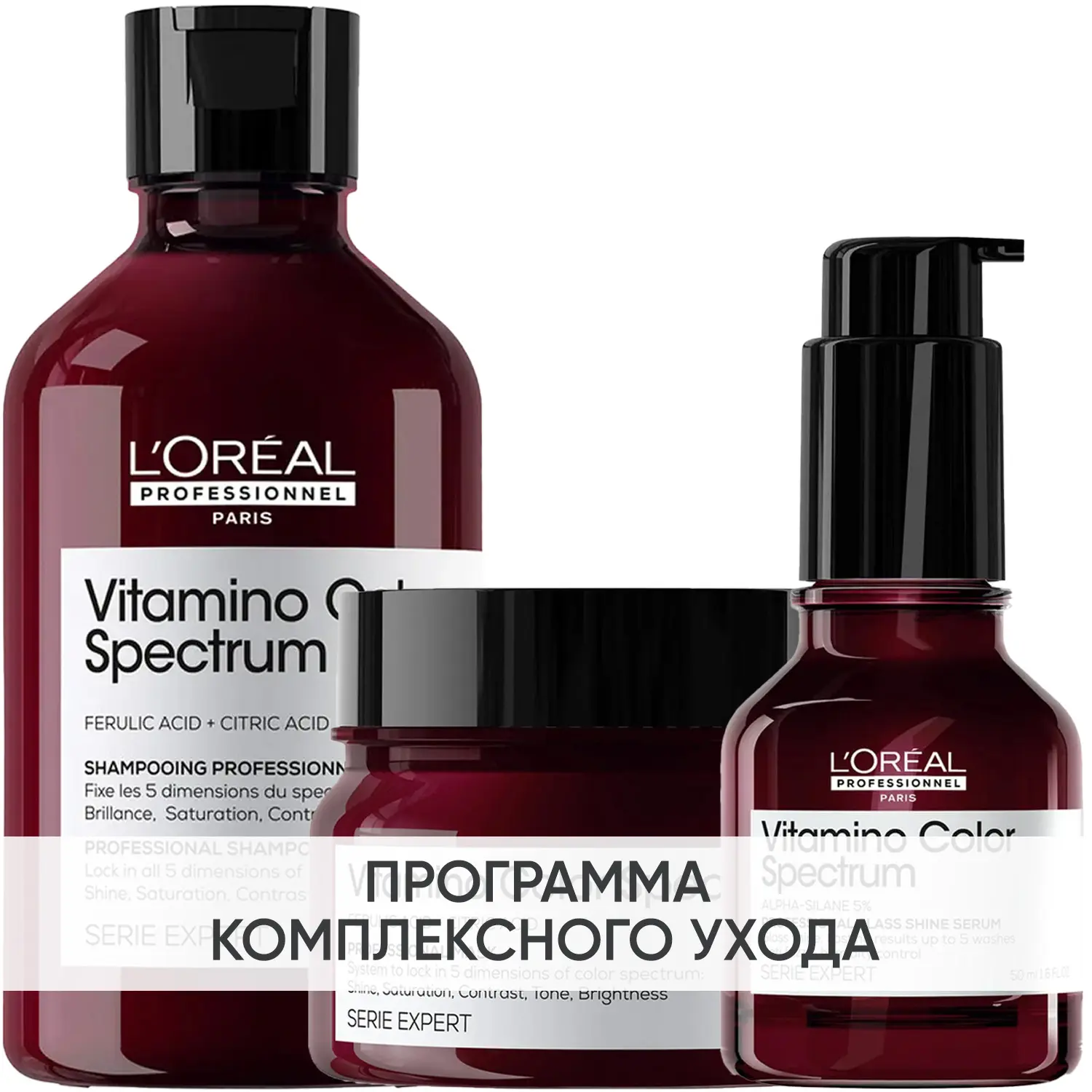 Эксперты проекта «Космедэль»* предлагают ПРОГРАММУ КОМПЛЕКСНОГО УХОДА L'oreal Professionnel Vitamino Color Spectrum для защиты всех параметров цвета (блеск, насыщенность, контраст, оттенок и яркость) и придания волосам сияния. Комплексный уход - это дополняющие друг друга средства, совместное использование которых максимально эффективно. Первым шагом программы является базовый уход (очищение + питание), вторым – дополнительный уход (средства, усиливающие эффект базовой программы и применяемые постоянно или периодически).