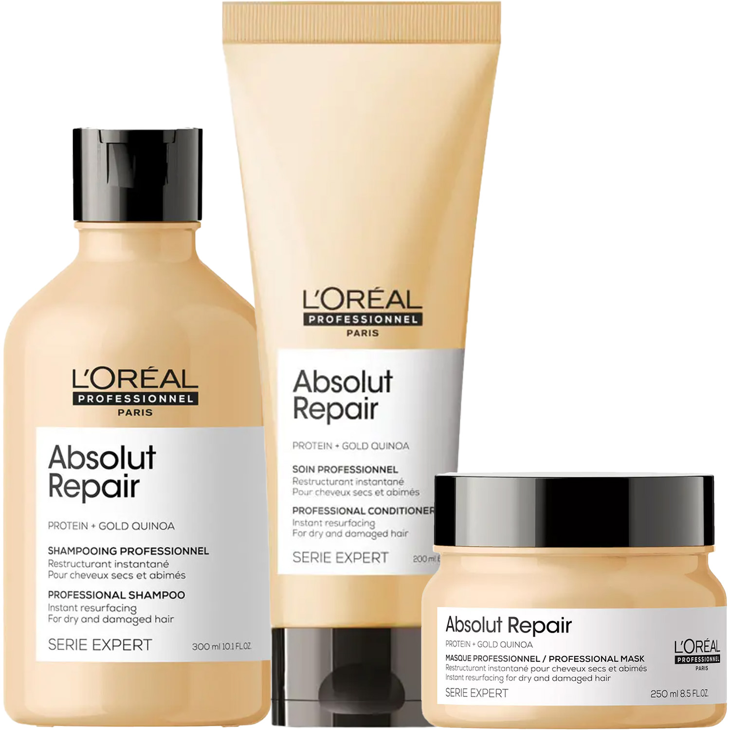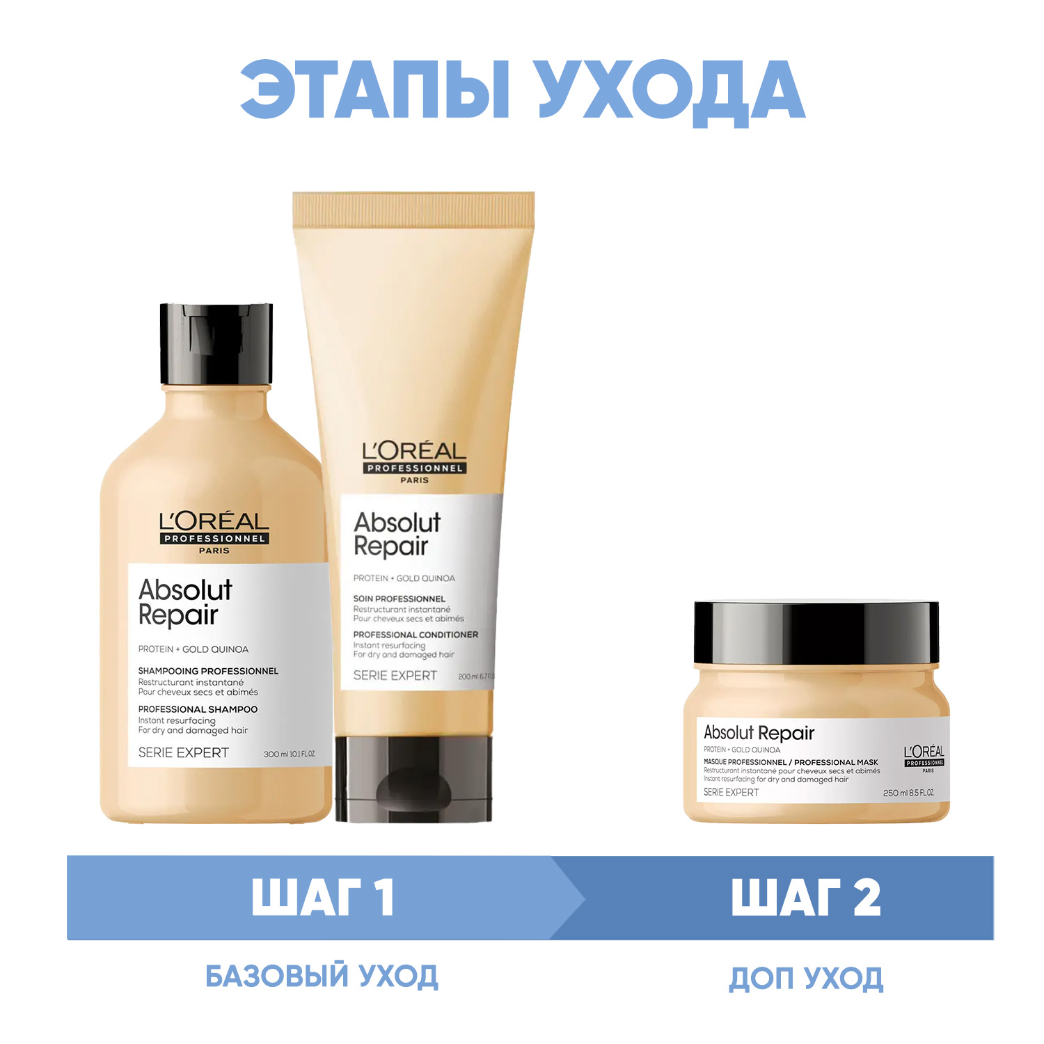 Эксперты проекта «Космедэль»* предлагают ПРОГРАММУ КОМПЛЕКСНОГО УХОДА L'Oreal Professionnel Absolut Repair для поврежденных волос. Комплексный уход представляет собой дополняющие друг друга средства, совместное использование которых будет максимально эффективным. Первым шагом программы является базовый уход (очищение + питание), вторым – дополнительный уход (средства, усиливающие эффект базовой программы и применяемые постоянно или периодически).
