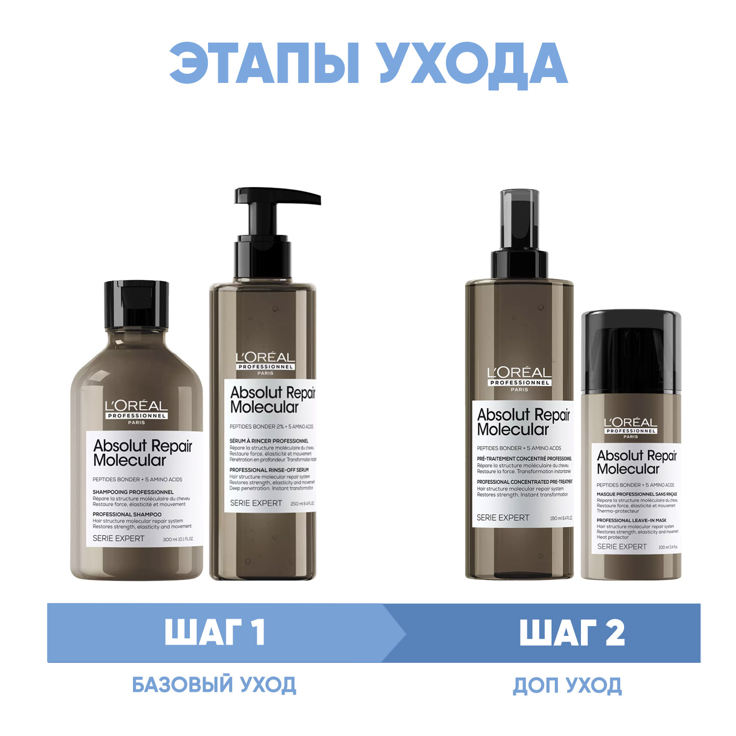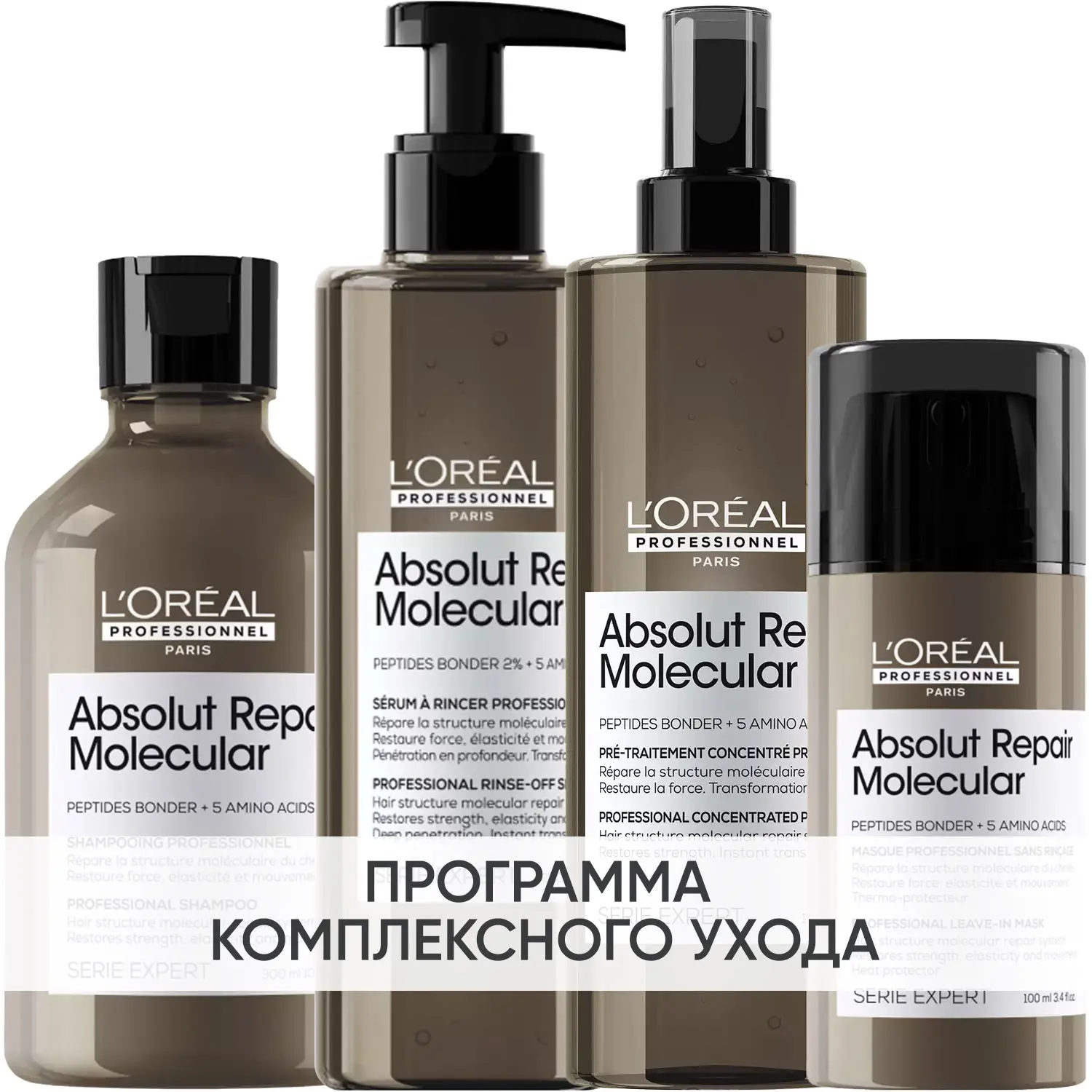 Эксперты проекта «Космедэль»* предлагают ПРОГРАММУ КОМПЛЕКСНОГО УХОДА L'Oreal Professionnel Absolut Repair Molecular для поврежденных волос. Комплексный уход представляет собой дополняющие друг друга средства, совместное использование которых будет максимально эффективным. Первым шагом программы является базовый уход (очищение + питание), вторым – дополнительный уход (средства, усиливающие эффект базовой программы и применяемые постоянно или периодически).