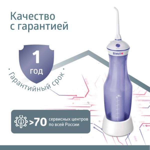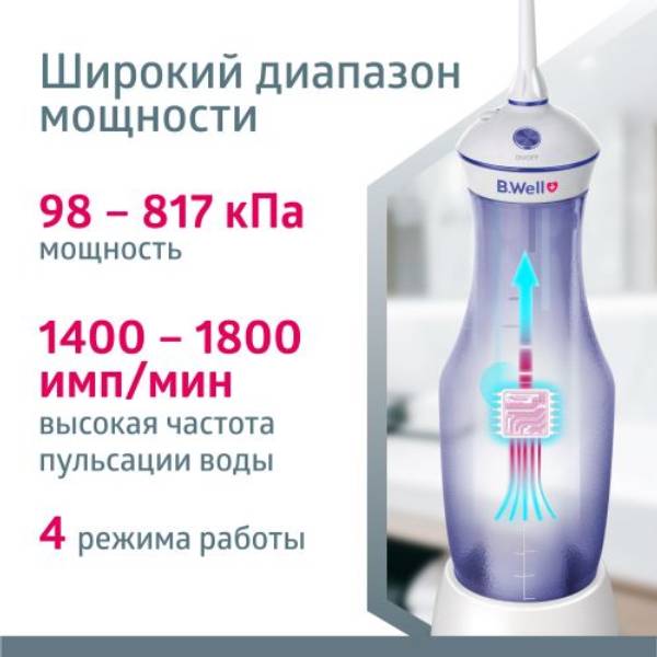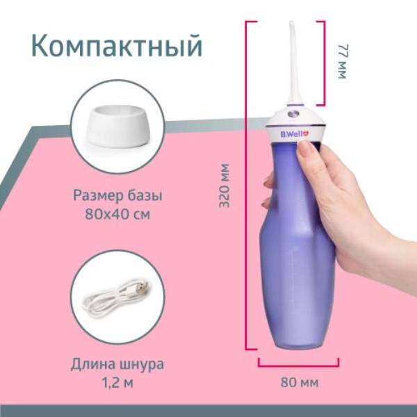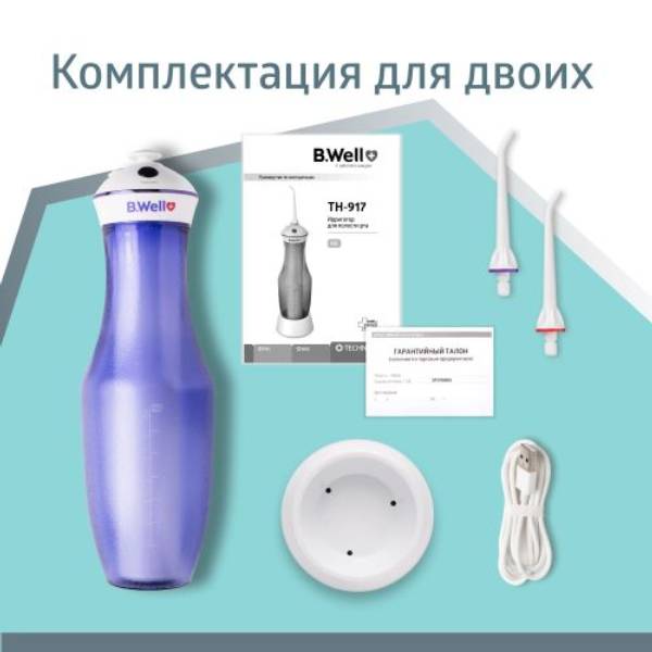 Портативный ирригатор B.Well ТН-917 эффективно удаляет остатки пищи, препятствует размножению бактерий, образованию зубного камня, развитию кариеса и ряду других проблем, вызванных недостаточным уходом. Ирригатор выделяется стильным дизайном, что делает его отличным аксессуаром для ванной комнаты и удачным подарком.
