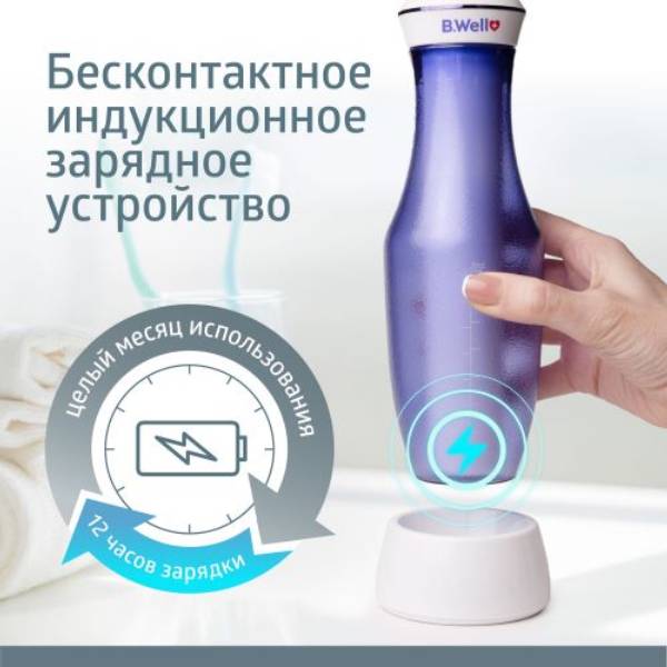 Портативный ирригатор B.Well держит заряд до месяца использования, не нуждается в розетке в ванной комнате или батарейках. Питание осуществляется от современной индукционной зарядки.