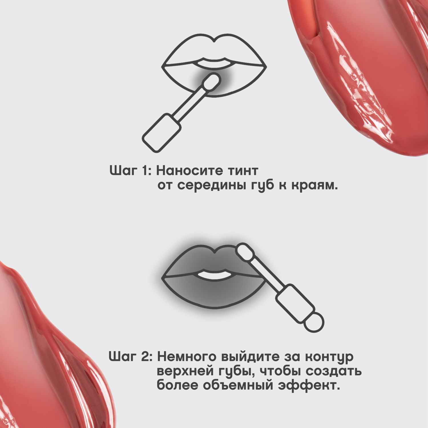 Наноси тинт от середины губ к краям. Для того, чтобы добавить губам объем без использования карандаша, нанеси тинт, немного заходя за контур верхней губы.