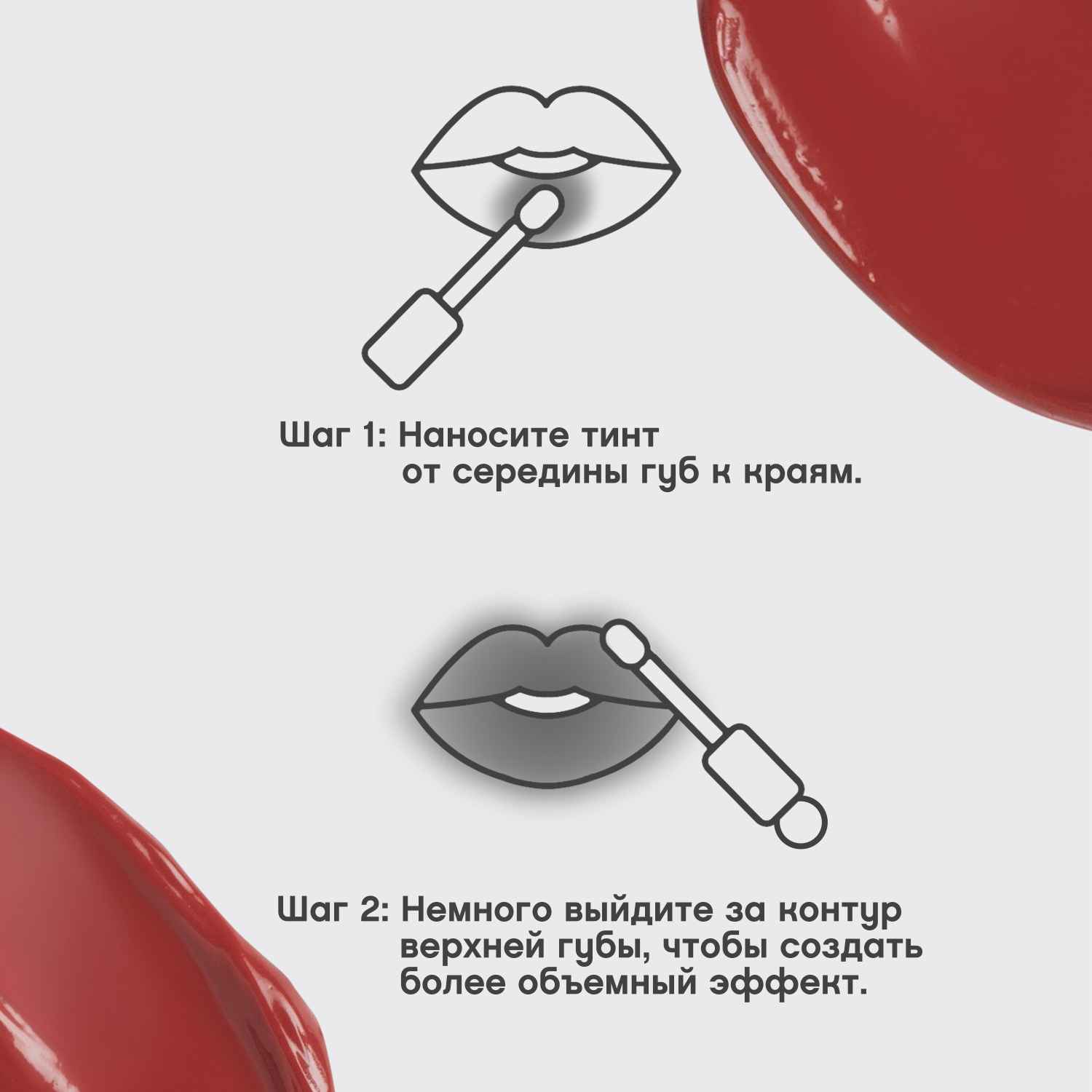 Наноси тинт от середины губ к краям. Для того, чтобы добавить губам объем без использования карандаша, нанеси тинт, немного заходя за контур верхней губы.