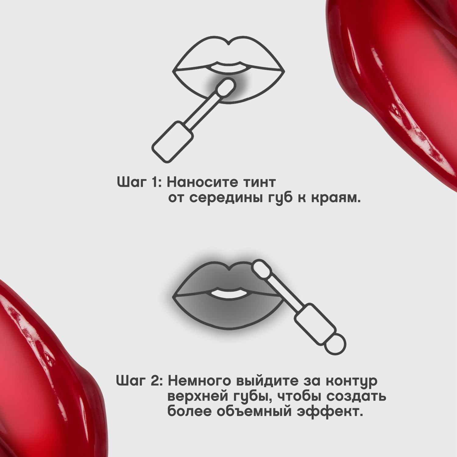 Наноси тинт от середины губ к краям. Для того, чтобы добавить губам объем без использования карандаша, нанеси тинт, немного заходя за контур верхней губы.