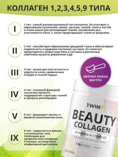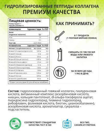 Содержит пептиды гидролизованного коллагена 1, 2, 3, 4, 5 и 9 типа и специально подобранные биологически активные вещества.