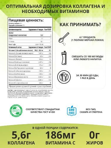 Наш организм нуждается в дополнительном приеме коллагена для здоровых связок, костей и красоты. Кроме того, для наилучшего усвоения и выработки коллагена необходим витамин С. Не является лекарственным средством.
