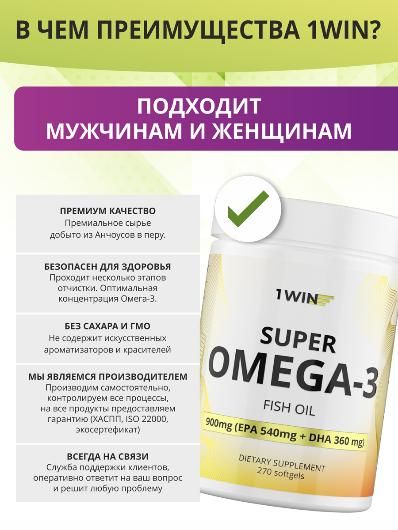 Комплексная пищевая добавка Омега-3 от 1Win поддерживает здоровье сердечно-сосудистой системы, мозга и обладает многими другими полезными свойствами. Жирные кислоты омега-3 являются важнейшими нутриентами для человека, так как выполняют биорегуляторную, структурную, энергетическую и запасающую функции. Кроме того, Омега-3 очень важна для поддержания хорошего зрения, красоты кожи, волос и ногтей и в целом для сохранения молодости и здоровья.