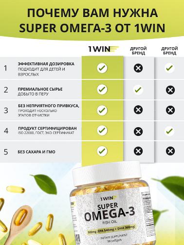 Комплексная пищевая добавка Омега-3 от 1Win поддерживает здоровье сердечно-сосудистой системы, мозга и обладает многими другими полезными свойствами. Жирные кислоты омега-3 являются важнейшими нутриентами для человека, так как выполняют биорегуляторную, структурную, энергетическую и запасающую функции. Кроме того, Омега-3 очень важна для поддержания хорошего зрения, красоты кожи, волос и ногтей и в целом для сохранения молодости и здоровья.