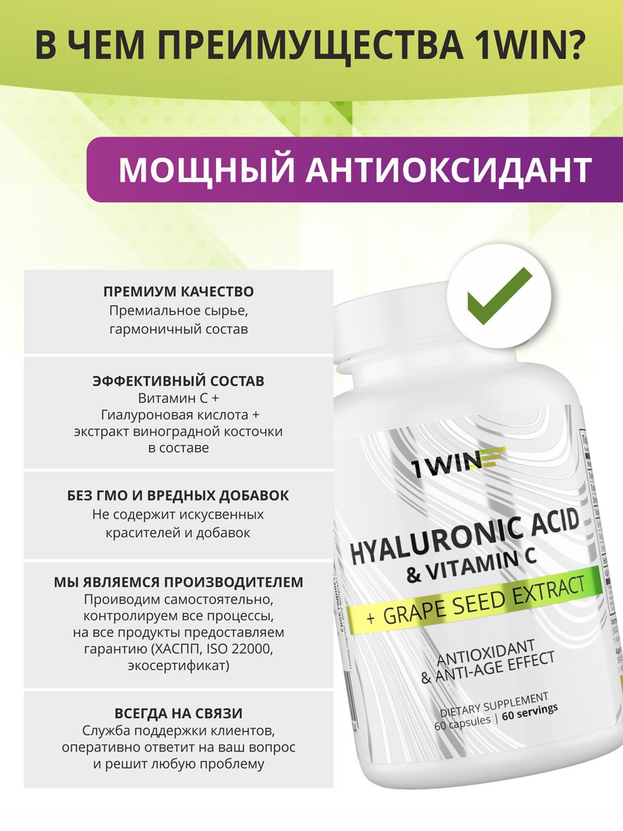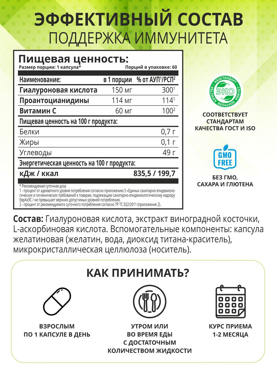 Комплекс «Гиалуроновая кислота с витамином С и экстрактом виноградной косточки» - это must have для здоровья и красоты. Максимум гиалуроновой кислоты - 150 мг (суточная норма) находится в каждой капсуле.