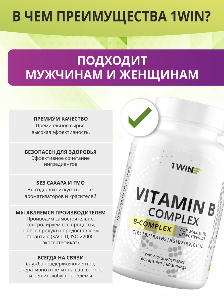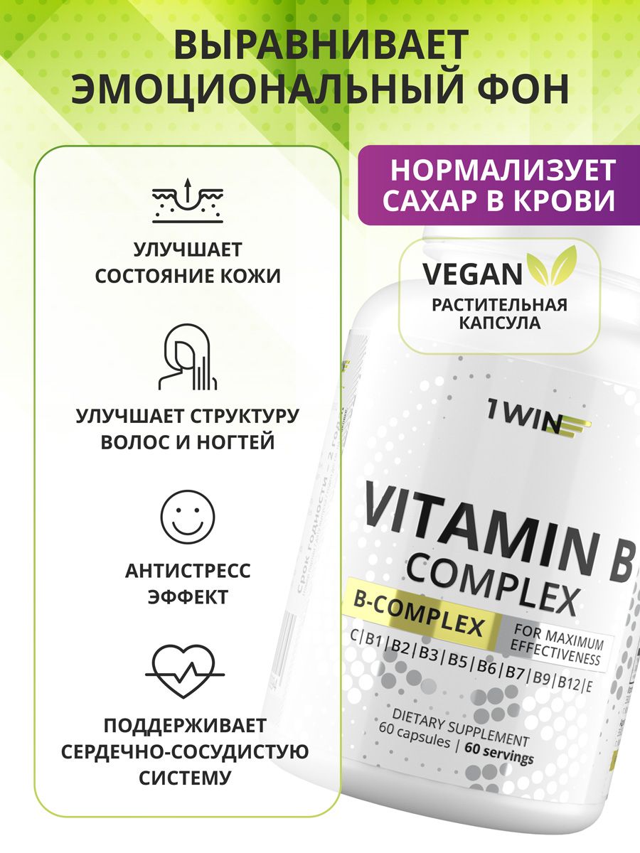 Комплекс витаминов группы В рекомендован в качестве дополнительного источника витаминов В1, В2, В3, В5, В6, В7, В9, В12, С и Е. Витамины группы В либо синтезируются в организме человека в очень маленьких количествах, либо не синтезируются вовсе. Комплекс помогает укрепить иммунную систему, благотворно влияет на нервную и сердечно-сосудистую системы, активизирует обмен веществ, нормализует микрофлору желудочно-кишечного тракта, помогает восстановить кожу и волосы.