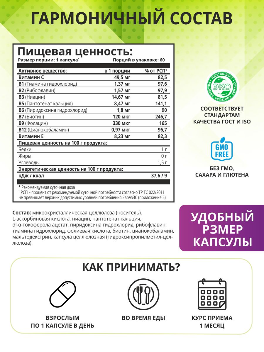Состав: витамины группы B, витамин С, витамин E, микрокристаллическая целлюлоза (носитель), мальтодекстрин, капсула целлюлозная (растительная).