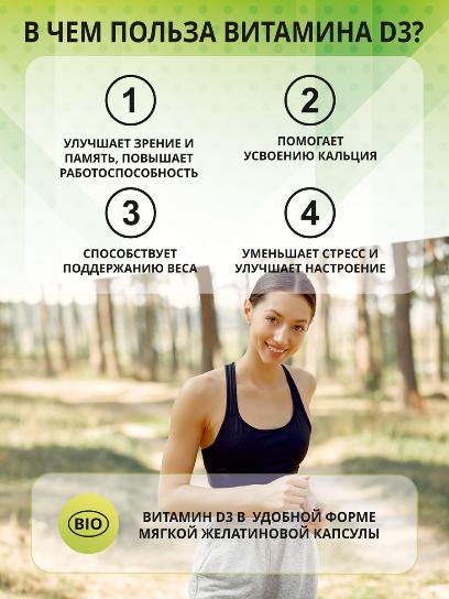 Витамин D3 формирует правильный скелет, повышает мышечный тонус, укрепляет иммунитет, помогает правильному обмену кальция и фосфора в организме, способствует восстановлению защитной оболочки, окружающие нервы. Также этот витамин нужен для функционирования щитовидной железы и нормальной свертываемости крови. D3 принимает участие в регуляции кровяного давления и сердцебиения.