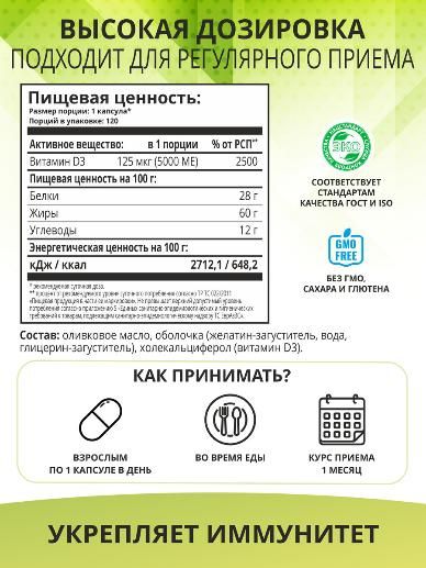 Состав: холекальциферол (витамин D3), оливковое масло, оболочка (желатин-загуститель, вода, глицерин-загуститель)