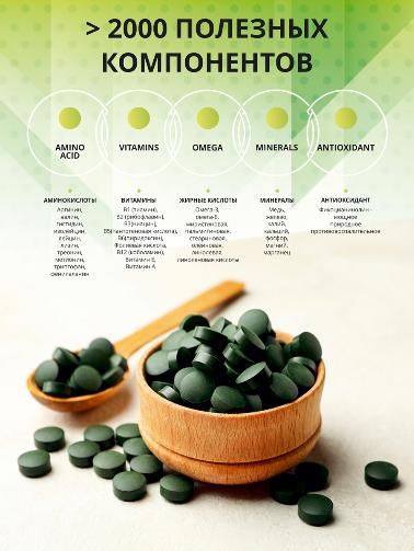 Спирулина укрепляет иммунитет, очищает кровь от шлаков и токсинов, ускоряет метаболизм. Применение добавки способствует восстановлению работы поджелудочной железы, нормализует уровень сахара в крови, а также укрепляет иммунитет. Спирулина увеличивает количество молочнокислых бактерий, тем самым, способствует нормализации состава микрофлоры кишечника.