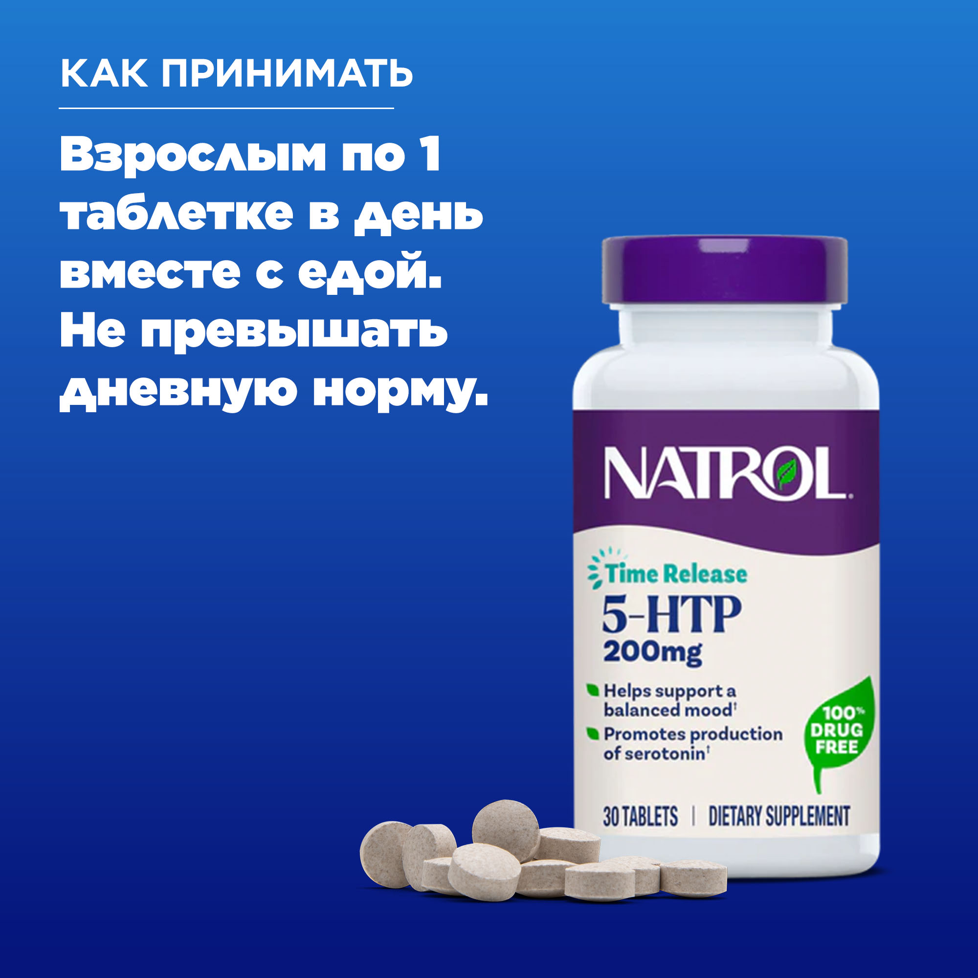 Natrol 5-HTP — это полностью немедикаментозный способ поддержки сбалансированного настроения. Таблетки с контролируемым высвобождением медленно высвобождают 5-HTP, способствуя выработке серотонина в течение дня.