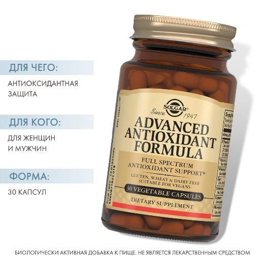 Капсулы Антиоксидантная формула разработаны американской компанией Solgar.Является биологической активной добавкой. Назначение - является дополнительным источником витаминов А, С, Е, В 2, В 6, бета-каротинов, марганца, цинка, меди, селена, флаволигнанов, взаимно усиливающих антиоксидантные свойства друг друга. Обеспечивает комплексную защиту организма от негативного воздействия свободных радикалов, провоцирующих старение. Особое внимание на прием Солгар "Антиоксидантная формула" стоит обратить в летний период года, поскольку ультрафиолетовое излучение активизирует процессы выработки свободных радикалов, что приводит, как считают многие специалисты, к преждевременному старению организма.