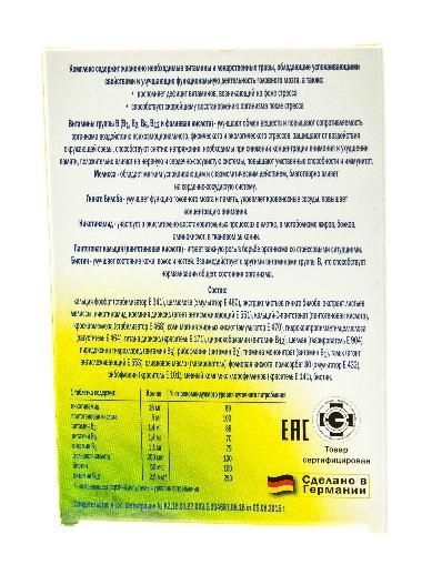 Комплекс содержит необходимые витамины и лекарственные травы, обладающие успокаивающими свойствами и улучшающие функциональную деятельность головного мозга, а также: восполняет дефицит витаминов, возникающий на фоне стресса; способствует скорейшему восстановлению организма после стресса; Мелисса – обладает мягким успокаивающим спазмолитическим, болеутоляющим и гипотензивным действием.