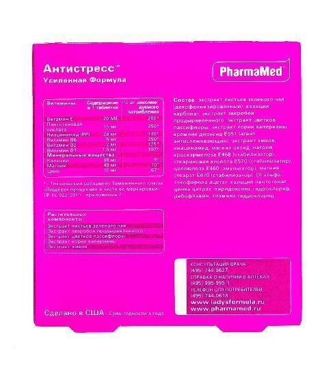 Стресс – типичное явление в жизни современной активной женщины. Особенности женского организма значительно повышают восприимчивость к стрессу. Чем это опасно? Помимо депрессии, постоянной усталости и апатии ко всему, что совсем недавно так интересовало и несло позитив, стресс может быть причиной нарушений здоровья (ПМС, тяжелый климакс, снижение либидо и т.д.). Lady’s formula Антистресс Усиленная Формула устранит симптомы стресса, вернет спокойствие и уверенность.