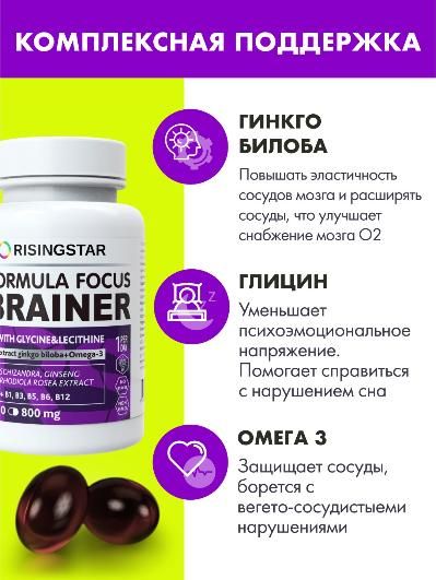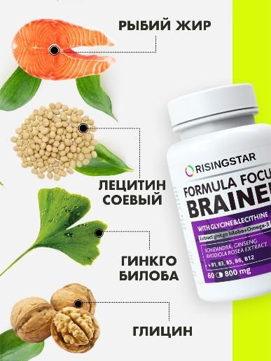 Эффективный комплекс с омега-3, глицином, лецитином, экстрактом гинкго билоба и витаминами группы В для улучшения мозговой деятельности. Нормализует работу нервной системы, улучшая мозговое кровообращение, концентрацию внимания и ясность ума. Это уникальное средство поможет мозгу пробудиться и сосредоточиться - показан при стрессовых моментах, неврозах, бессоннице; способствует улучшению когнитивных функций, улучшает способность к обучению и память, уменьшает неблагоприятное воздействие лекарственных средств и алкогольных напитков. Производится с соблюдением требований стандартов GMP и ISO 22000.