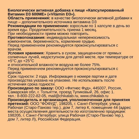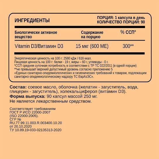 Состав: соевое масло, оболочка (желатин - загуститель, вода, глицерин - загуститель), холекальциферол (витамин D3)