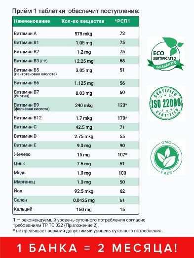 Состав: кальция карбонат, лактоза, витаминный премикс (натрия аскорбат, токоферола ацетат, никотинамид, ретинола ацетат, пантотенат кальция, пиридоксина гидрохлорид, рибофлавин, холекальциферол, тиамина мононитрат, фолиевая кислота, биотин, цианокобаламин, лактоза), минеральный премикс (железа сульфат, цинка оксид гептагидрат, меди сульфат пентагидрат, марганца сульфат моногидрат, калия йодат, натрия селенит, лактоза), крахмал, стеарат кальция, марганца глюконат дигидрат.