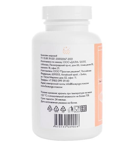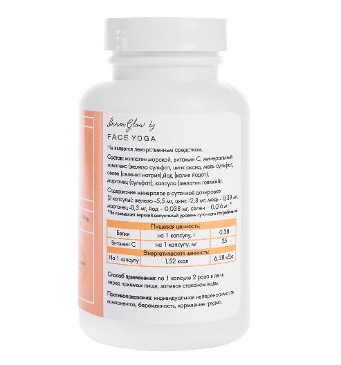 Состав: коллаген морской, витамин С, минеральный комплекс (железо сульфат, цинк оксид, медь сульфат, селен (селенит натрия), йод 9 калия йодат), марганец (сульфат), капсула (желатин).