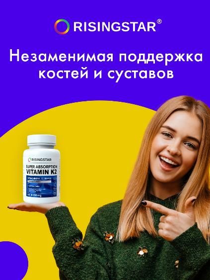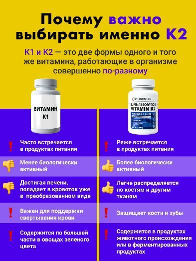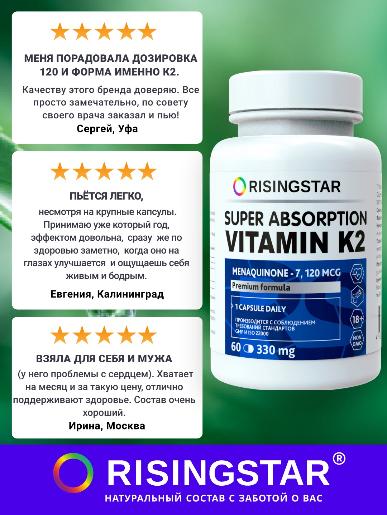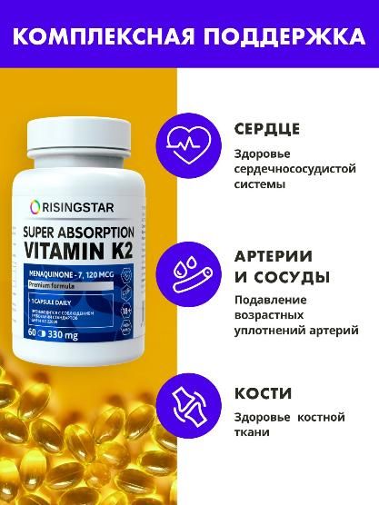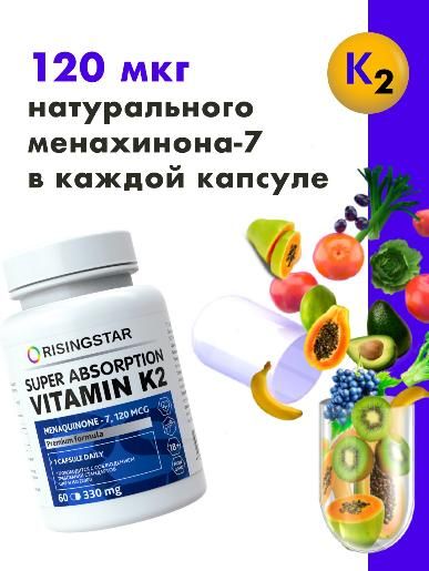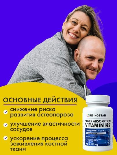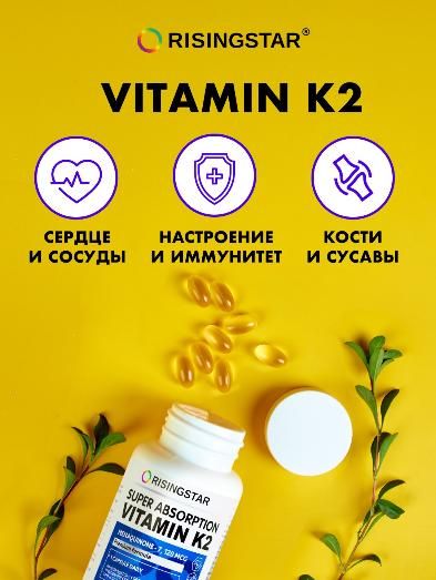 Запатентованная формула витамина К2 120 мкг в форме менахион-7 усваивается в 10 раз быстрее аналогов и оказывает максимальное физиологическое действие. Биодоступная форма MenaQ7 играет важную роль в правильной работе артерий благодаря своей способности поддерживать правильный метаболизм кальция в кровеносных сосудах. Способствует укреплению костей за счет регуляции кальциевого обмена в организме и его депонирования в костной ткани. Оптимальная дозировка 120 мкг в одной капсуле в день обеспечит 100% адекватного уровня потребления витамина К.
