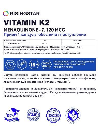 Состав: оливковое масло, витамин К2, пищевая добавка Гриндокс (рапсовое масло, аскорбилпальмитат, концентрат смеси токоферолов, лецитин), капсула желатиновая (желатин, глицерин).