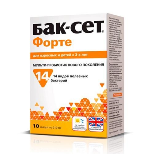 Комплекс из 14 видов живых пробиотических бактерий помогает восстановить микрофлору кишечника и нормализовать пищеварение при дисбактериозе, запорах, приеме антибиотиков, кишечных инфекциях, аллергических состояниях. Пробиотические бактерии в Бак-Сет форте содержатся в высоких концентрациях, что позволяет им достигать толстого кишечника без потери активности и жизнеспособности.