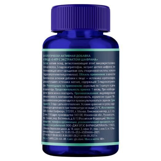 Состав: 1 вегетарианская капсула (суточная дозировка) содержит: магния — 120 мг (из магния оксида), 5-гидрокситриптофан (из экстракта гриффонии) — 50 мг, экстракт цветков шафрана, стандартизованного по кроцину, — 30 мг.