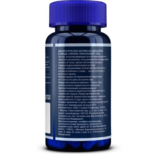 Состав: 1 вегетарианская капсула содержит хрома пиколинат - 2 мг, в том числе хрома 250 мкг