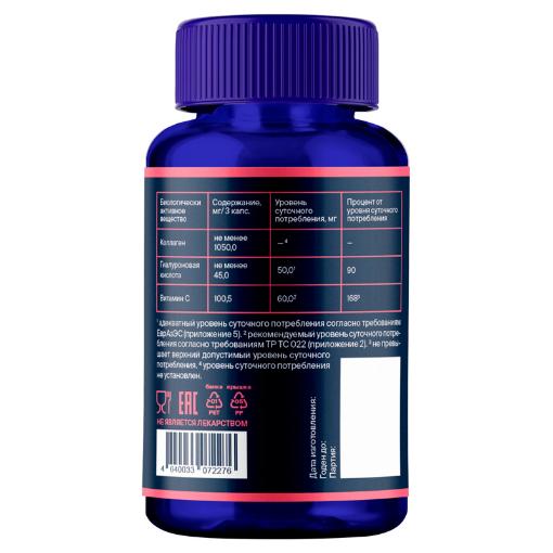Состав: 3 вегетарианские капсулы содержат гидролизат рыбного коллагена – 1050 мг, гиалуроновая кислота – 45 мг, аскорбиновая кислота - 100,5 мг