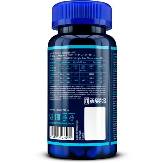 Состав: 2 капсулы содержит ПНЖК омега-3 — не менее 900 мг, в том числе эйкозапентаеновая кислота (ЭПК) —  500 мг, докозагексаеновая кислота (ДГК) — 200 мг.