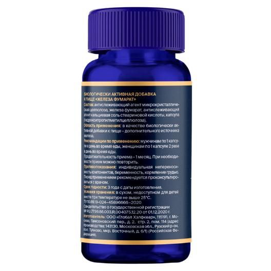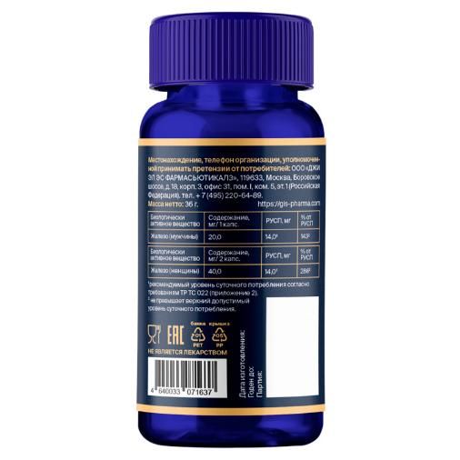 Состав: 2 вегетарианские капсулы (суточная доза для женщин) содержат железа фумарат — 120 мг (в т.ч. железа 40 мг); 1 вегетарианская капсула (суточная доза для мужчин) содержит железа фумарат — 60 мг (в т.ч. железа 20 мг).