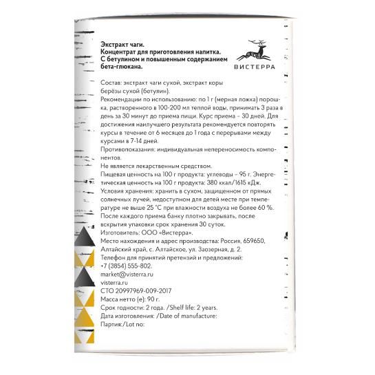 Активность экстракта чаги обусловлена наличием уникального комплекса биологически активных веществ: пигментами (образующими хромогенный полифенолкарбоновый комплекс), полисахаридами, тритерпеновыми и органическими кислотами. В состав берёзового гриба входят микроэлементы: цинк, никель, натрий, медь, марганец, магний, кобальт, кальций, калий, кремний, железо.