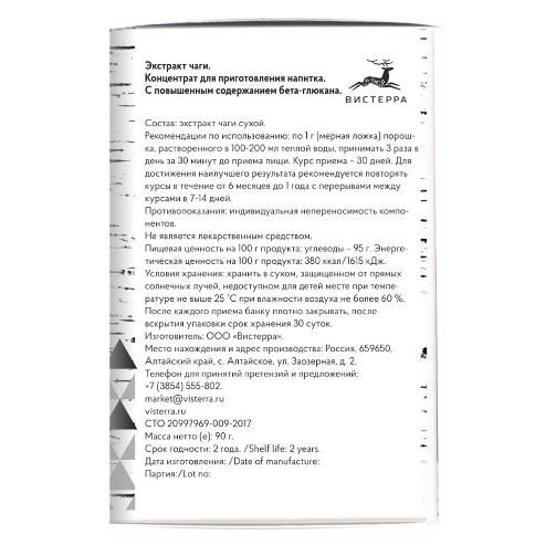 Активность экстракта чаги обусловлена наличием уникального комплекса биологически активных веществ: пигментами (образующими хромогенный полифенолкарбоновый комплекс), полисахаридами, тритерпеновыми и органическими кислотами. В состав берёзового гриба входят микроэлементы: цинк, никель, натрий, медь, марганец, магний, кобальт, кальций, калий, кремний, железо.